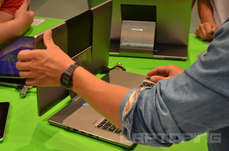 The Acer Aspire R7 series with its “neck” or officially “Ezel hinge” and the trackpad positioned above the keyboard is one of the innovatively designed laptops on the market and surely the weirdest looking one. Besides different keyboard / trackpad input experience, it has ability to keep the 15.6-inch touch-screen in various positions – from rear-facing and laptop modes to almost flat tablet mode and all positions in between. The R7-571-6858 is one of the Acer Aspire R7 configurations, providing mid-tier internal components at a price of $900.