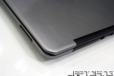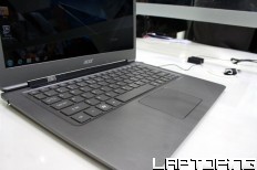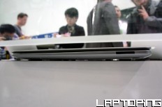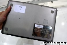 Overall, the build quality is excellent, from the brushed aluminum notebook lid, to the magnesium alloy palm rest area, the flex-free chiclet keyboard, and one-piece touchpad with good responsiveness and touch quality. Other non-conventional laptop design features are a vent-free bottom (vents blow on the back) for cool operation in laps, a power button which can be pressed while the lid is closed, and rear location of a pair of USB ports and HDMI output. On its left side is located only a headphone jack, while on the left there’s a memory card reader. Stereo speakers are positioned on the bottom of the case. We can’t tell how music from the laptop sounds, since there was too much noise in the expo hall.