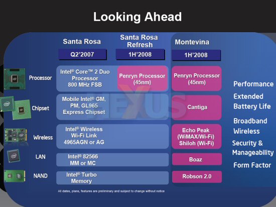 Intel’s “Santa Rosa” and forthcoming Core 2 Duo processors designed for the next-generation laptop platform will feature an 800MHz front side bus, which is up from 667MHz of current “Napa” platform.